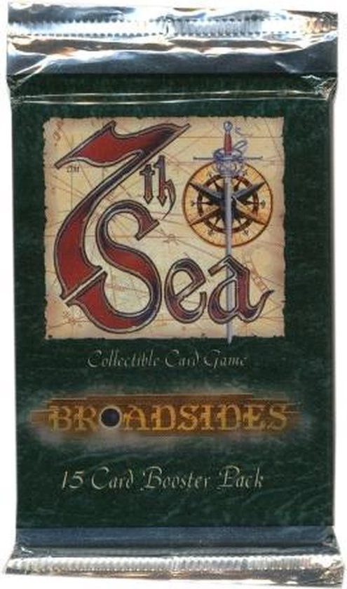 Broadsides is a reprint of No Quarter, except for six faction-specific cards of the 7th Sea CCG. It was printed by Alderac Entertainment Group in 1999 and consists of 323 cards. The set icon is white crossbones on a green background.