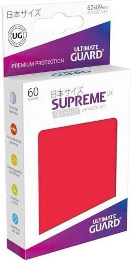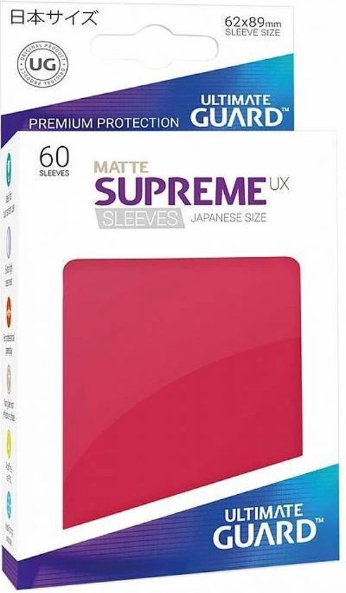 Ultimate Guard Supreme UX Sleeves Japanese Size Matte Red is verpakt in een kartonnen doosje met 60 UX sleeves. En zijn geschikt voor TCG kaarten zoals Yu-Gi-Oh en Cardfight! Vanguard.