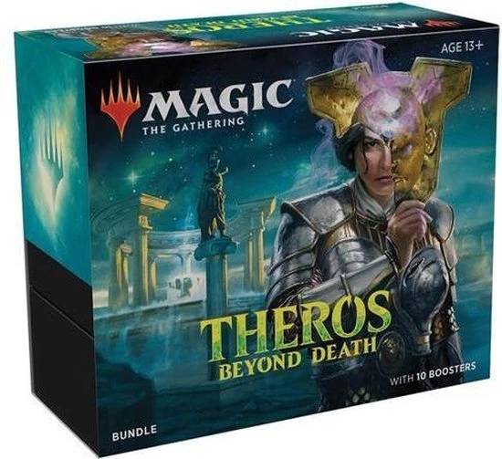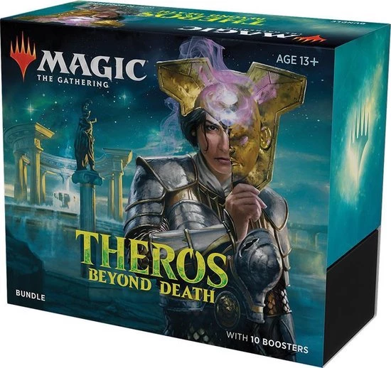 Magic: The Gathering set Theros Beyond Death richt zich op de onderwereld van de Theros plane, waar Griekse mythologie en goden centraal staan. De set kenmerkt zich ook door de terugkeer van Planeswalker Elspeth Tirel en introduceert de mechanics Escape, Flash en Sagas. Ook de mechanics Constellation en Devotion keren terug. Deze set bestaat uit 254 kaarten, waaronder 5 speciale full-art basic lands.Een Bundle bevat 10 Theros Beyond Death Draft Booster packs, 20 Foil lands, 20 Regular lands, 1 foil promokaart, 1 Oversized Spindown lifecounter, 2 referentiekaarten en 1 storage box.